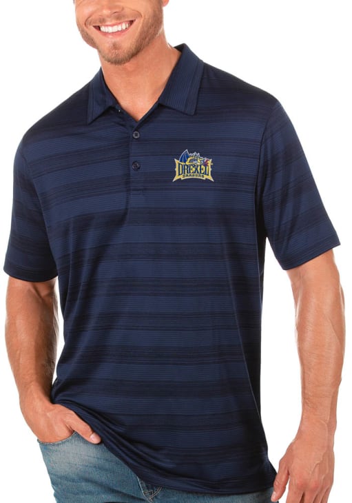 Enhance your professional style with this striking Mens Navy Blue Short Sleeve Polo Shirt! Showcase your team pride among colleagues with this exceptional Drexel Navy Blue Compass Tonal Stripe Short Sleeve Polo. Stand out and make a statement in this Drexel Dragons Short Sleeve Polo, featuring a team logo embroidery on left chest that adds a touch of distinction to your look.