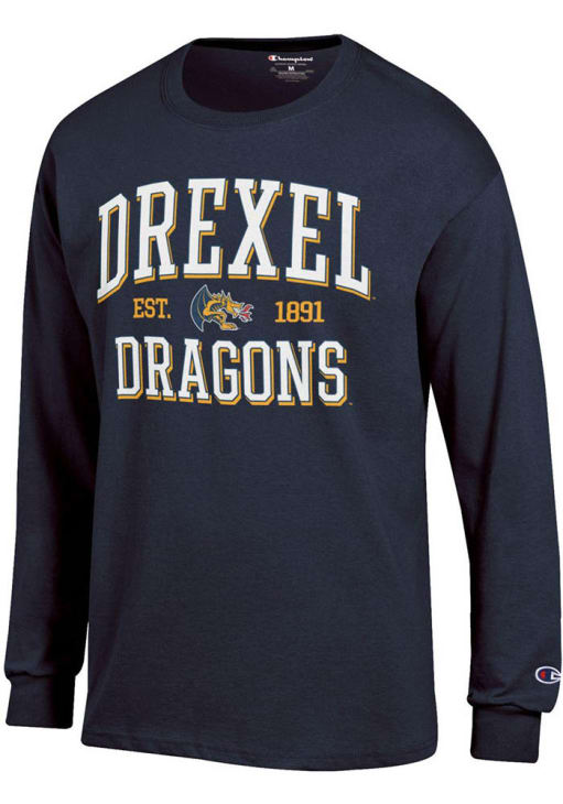 Show your Drexel Dragons spirit in this Drexel Navy Blue T Shirt! This Drexel Est Date Jersey Long Sleeve T Shirt makes a great layer for cooler nights cheering on the Dragons. Featuring a printed team graphic on front chest, this Drexel Dragons Long Sleeve Tee is an essential addition for every fan. Go Dragons!!