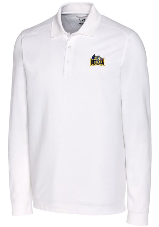 Make a bold statement in this Drexel Dragons Cutter and Buck Mens White Advantage Pique Long Sleeve Long Sleeve Polo! This Polo features a high quality tri-blend pique that combines super soft cotton with DryTec polyester and spandex, making this Mens Long Sleeve Polo Shirt perfect for any Drexel fan who wants to display their spirit in any setting.