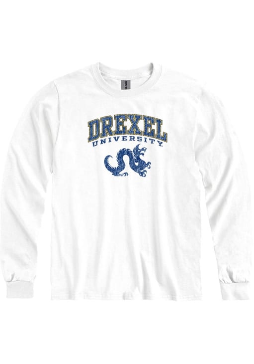 Show your Drexel Dragons spirit in this Drexel White T Shirt! This Drexel Arch Mascot Long Sleeve T Shirt makes a great layer for cooler nights cheering on the Dragons. Featuring a screenprint graphics, this Drexel Dragons Long Sleeve Tee is an essential addition for every fan. Go Dragons!!